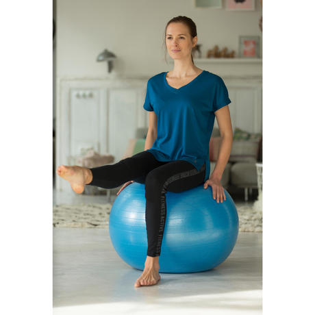 Usiądź na niej i wyreguluj poziom napompowania (możesz lekko spuścić powietrze) dla właściwego dopasowania piłki do Twojego wzrostu. Twoje kolana powinny znajdować się na wysokości bioder lub lekko poniżej linii bioder. Jeśli chcesz zaoszczędzić czas, do pompowania piłki możesz używać pompki do Swiss Ball (sprzedawana oddzielnie).