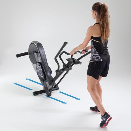 Twój rower eliptyczny posiada w przedniej części rolki transportowe. Jeśli chcesz przesunąć rower, stań na wprost niego. Stopą zablokuj rower, pociągnij w dół kierownicę, tak by rower stanął na rolkach. Następnie powoli przesuń go w wybrane przez ciebie miejsce.