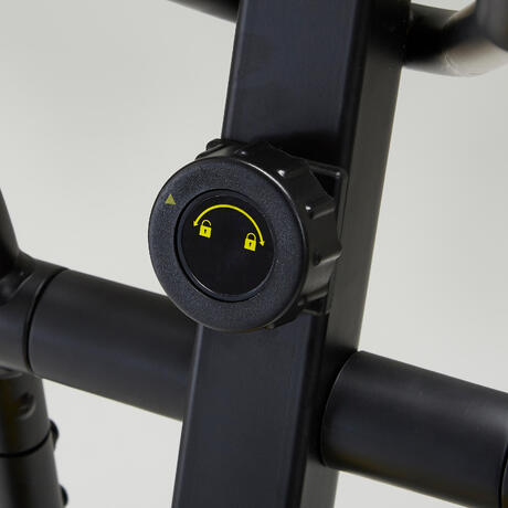 - Pokrętło blokujące ramiona i pedały zwiększa bezpieczeństwo podczas wchodzenia/schodzenia z roweru eliptycznego.Tę funkcję można wyłączyć.